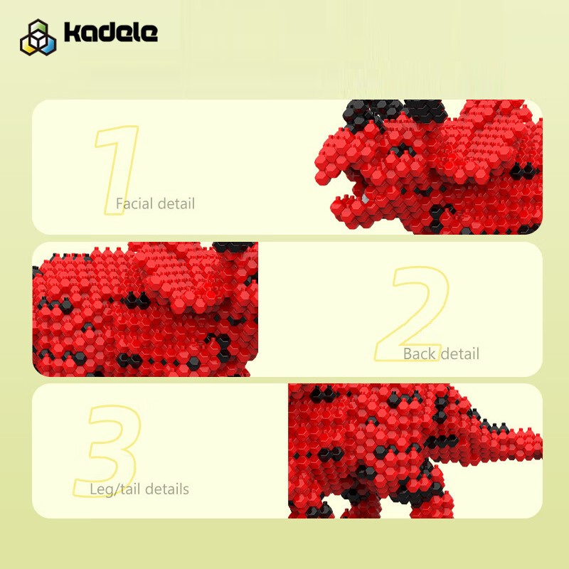 Ispirati agli antichi incastri a tenone e mortasa cinesi, i mattoncini sfaccettati brevettati di KADELE si connettono in qualsiasi direzione: in alto, in basso, lateralmente e persino in diagonale. Questo sistema multidirezionale permette di creare curve morbide, strutture robuste e un'anatomia di dinosauro realistica senza pezzi che si incastrano. Ogni soddisfacente "clic" blocca saldamente un altro pezzo al suo posto, insegnando ai bambini che la creatività non ha limiti.