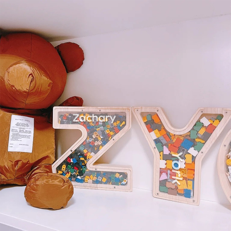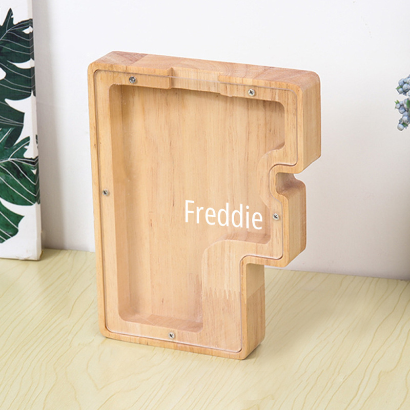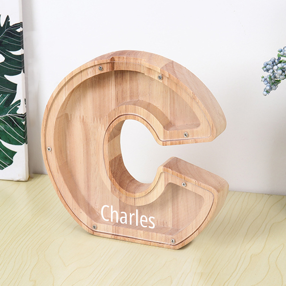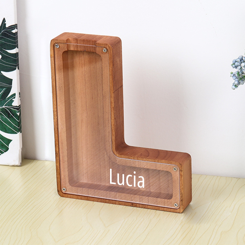 Salvadanaio personalizzato con lettera e contenitore per materiali creativi – Design combinato in legno e acrilico